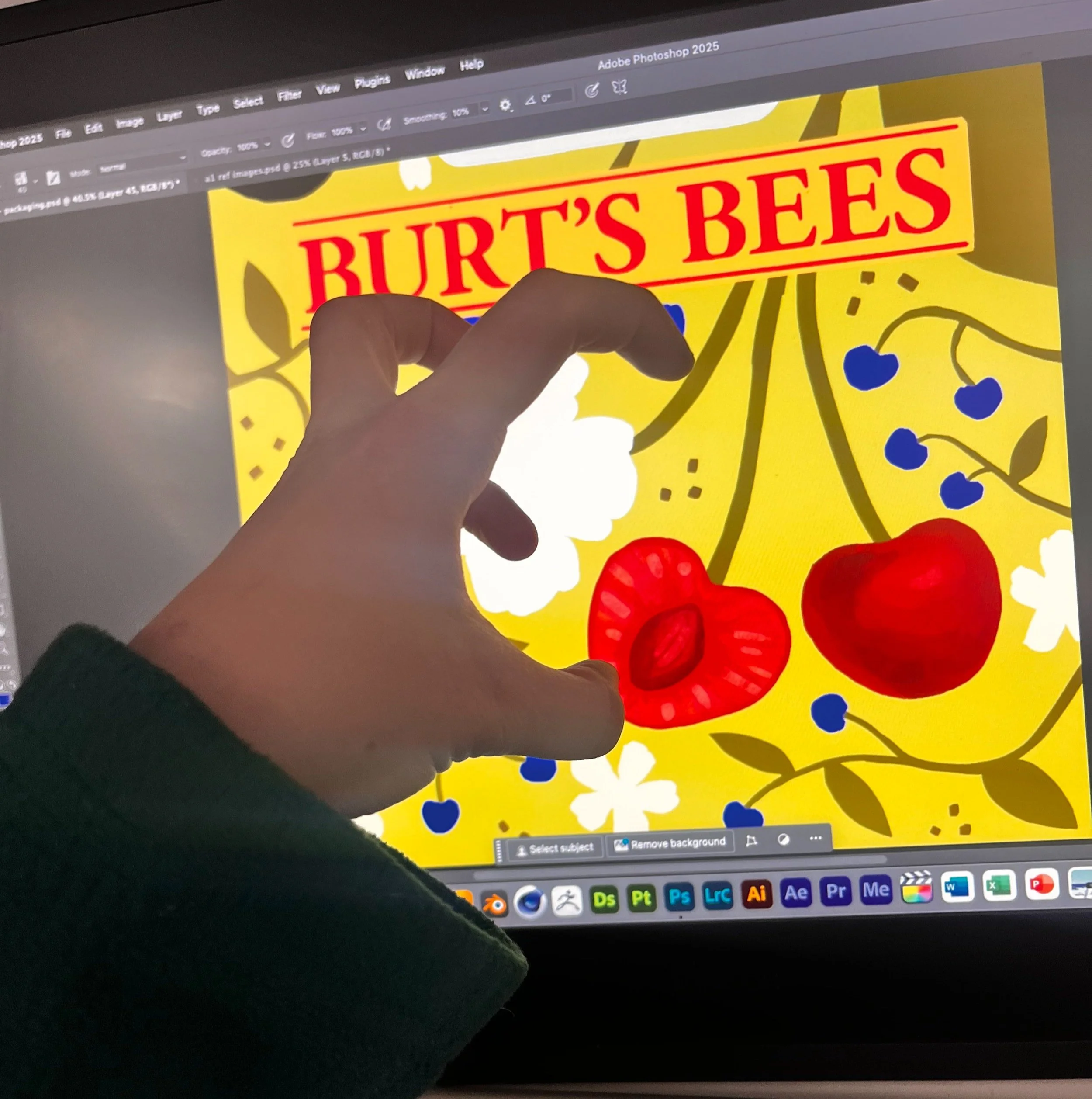 In Spring 2025, I had the opportunity to take a course in Advertising Illustration. The first assignment in that course was to advertise a product of our choice, and I chose to redesign the packaging for and create an accompanying promotional advertisement for Burt’s Bees Wild Cherry flavored lip balm.