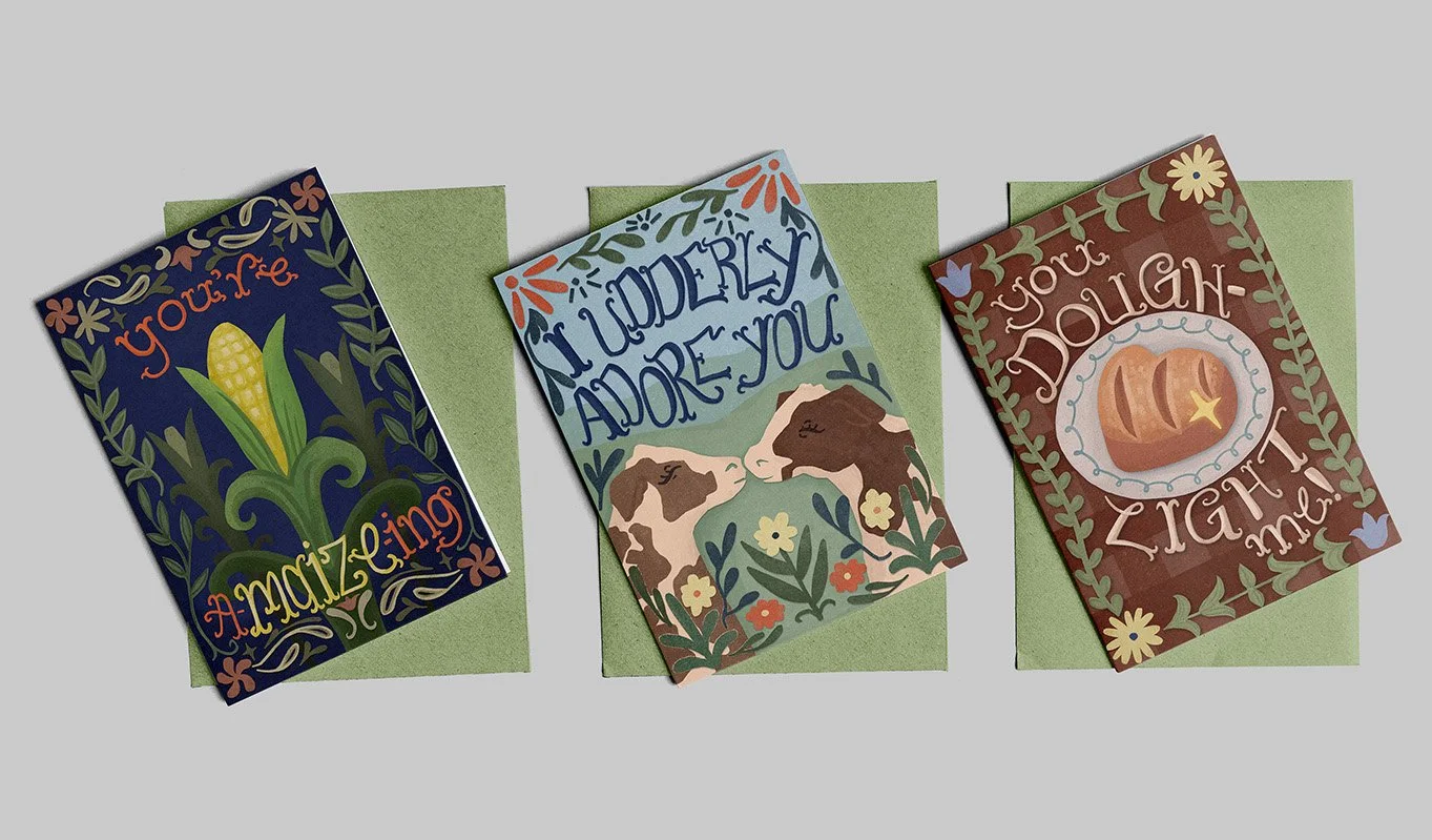 For my final project for my Type and Image class, the assignment was fairly open-ended, with the requirement being we choose from 4 themes provided to us by the professor. The theme I chose to use for my project was Country Folk, and I chose to create a set of greeting cards to follow that theme.